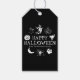 Feliz Halloween nombre personalizado espeluznante Etiquetas de regalo en blanco y negro con jack de texto de personalizable o linterna, calabaza, bruja, fantasma, cráneo, luna, gato negro