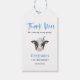 Etiqueta de regalo de cumpleaños de un niño rústico con ilustracion acuarela de una vaca bebé con un gorra fiesta azul. El texto dice "gracias a moo por venir a mi fiesta".