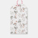 La etiqueta de regalo de la fiesta de cumpleaños de un niño con un tema floral con acuarela y ilustracion de flores silvestres. El texto dice "nuestra pequeña flor silvestre es X".