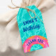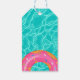 Esta etiqueta inspirada en la fiesta de cumpleaños, inspirada en el retro, cuenta con agua de piscina azul brillante, un tubo interior de donut rosa dulce y tipografía divertida. Este diseño es una gran elección para los fiestas de la piscina infantil.