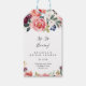 Estas etiquetas de regalo de ducha tropical colorida con sorbo húmedo nupcial son perfectas para una moderna ducha de boda. El diseño está decorado con flores blancas, rosas, ruidosas, burdeos y violetas elegantes dispuestas en bonitos ramos de vegetación.