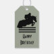 Una etiqueta de regalo con tema de caballo. Una silueta de caballo y jinete con un jinete ecuestre en un puente/cazador que salta sobre una valla.