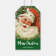 Etiquetas de regalo con una imagen retro que muestra a un feliz y sonriente Santa Claus rodeado de una corona de pino con un sorbo de hueso en su gorra.