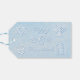 El bonito diseño blanco y azul claro tiene un aspecto espumoso y texturado. El texto del personalizable dice: "Feliz Hanukkah" por un lado y "A:" y "Desde" por el otro. Los gráficos incluyen Star of David, Menorah, dreidel, diez comandantes, copos de nieve y un muñeco de nieve.