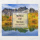 Etiquetas de botellas de evento boda con una hermosa fotografía de campo. Montañas de piedra con un bosque otoñal de colores vivos. Un lago tranquilo refleja las montañas, los árboles y las hierbas.