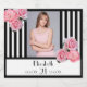 Una etiqueta para un fiesta de 21 años. Rayas verticales clásicas delgadas en blanco y negro como fondo. Con flores femeninas y femeninas, rosas rosadas y peonías como decoración. Un cuadro delante con plantilla para los 21 años, nombre y fechas. Plantilla para su propia foto vertical.