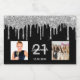 Por una diversión, glamurosa fiesta de 21 años. Color de fondo negro clásico, decorado con tonalidades purpurinas plateadas falsas, con pinturas que gotean. Personalice y agregue un nombre, edad 21 y fecha. Fecha de nacimiento o fecha del fiesta. Letras de color blanco y gris. Añade 2 - dos de tus propias fotos de sus amigos, familia, niños, destino de viaje de sueño, niños, novio/esposo.