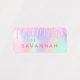 Un fondo iridiscente de diseño de color arcoiris con tonos pastel de unicornio y arcoiris en rosa, violeta, dorado rosa, verde menta. Decorado con goteo falso purpurina en oro rosa, rosa y morado. Personalice y añada un nombre y un número de teléfono, escrito con un guión de estilo con letras a mano moderno. Letras de color rosa.
