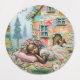 Una joven chica con flores de colores en su cabello está durmiendo tranquilamente frente a una casa caprichosa hecha de varios fragmentos de papel coloridos. El lugar está rodeado de árboles relucientes y flores florecientes que crean un ambiente de ensueño. Photoshop CS5 de arte digital