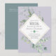 Invitación de boda con hojas de eucalipto verde salvia acuarela y dorado. Tipografía moderna con campos de plantilla de texto delante y detrás para que puedas añadir rsvp, detalles adicionales de recepción, registro de regalos y más. Ahorra el gasto añadido de los sobres. Ideal para una boda de jardín, bosque en el patio trasero, campo, granero, boho.