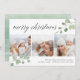 La tarjeta de vacaciones festivas presenta hojas de eucalipto de acuarela de color verde pastel adornando tres de tus fotos cuadradas favoritas dispuestas una al lado de la otra en un formato de collage. "Feliz Navidad" aparece en la parte superior en tipografía de letra a mano. Personaliza con tu saludo personalizado y nombres en la parte inferior derecha.