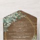 Esta rústica invitación a la boda de boho eucalyptus todo en uno incluye las invitaciones y una postal de RSVP desgarradora para que sus invitados puedan regresar fácilmente. No se necesita ningún sobre para enviar por correo, pero si lo desea puede añadir sobres blancos simples. Las buquetas de hojas de eucalipto decoran el marco geométrico dorado, con el texto en fuentes modernas y elegantes, y un fondo rústico de madera marrón. *Si necesitas productos adicionales que coincidan, por favor revisa la colección, o envíame un mensaje a través de Zazzle para obtener ayuda.