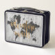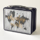 Un diseño lindo con una frase de texto dorada y un mapa negro del mundo sobre un fondo de tabla gris. Artista: Studio W