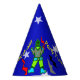 Robot espacial verde lindo niño personaje de caricatura alienígena Capitán Zacky. Diluir algo de diversión de la fiesta de cumpleaños con este chico robot verde y sonriente, único en su clase, con un traje amarillo y verde, botas de espacio azul claro y la apariencia de luces de colores 3D como accesorios en el cinturón, las bandas de muñeca y el cuello. Él tiene su Z en esta camisa. Los gorras fiestas tienen un fondo azul con estrellas y unos rayos de colores. Divertidos gorras alienígenas de fiesta de cumpleaños para cualquier niño o chica que ame robots, naves espaciales, extraterrestres y explorar la galaxia. Diseño original de ilustraciones gráficas © 2014, 2016 TamiraZDesigns. Todos Los Derechos Reservados. Visita mi tienda para más artículos originales: www.zazzle.com/tamirazdesigns*