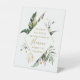 Este cartel conmemorativo boda presenta un marco falso de forma de diamante dorado decorado con foliaje tropical verde acuático, hojas de palmera, hojas de plátano y falsas hojas de oro con el texto "Sabemos que estarías aquí hoy si el cielo no estuviera tan lejos". Es perfecto para una boda tropical, de playa o de destino.