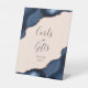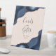 Una moda, un signo elegante para agradecer a los invitados bodas en su mesa de Tarjetas y Regalos. Las palabras "Tarjetas" y "Regalos" aparecen en caligrafía de escritura a mano gris carbón, con "¡gracias!" debajo en letra serif. Los diseños de agate acuarela azul marino recortados con purpurina de imitación de oro rosa enmarcan el mensaje en dos esquinas sobre un fondo ondulado. Consulte nuestra colección para ver el paquete de invitación a la boda y la papelería del día.
