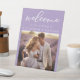 Este encantador cartel de la bienvenida de un boda lilac incluye una hermosa tipografía blanca sobre un suave fondo violeta junto con la foto de su pareja para una ceremonia de primavera por la tarde. Decoración de color pastel de lavanda con una fotografía de compromiso para una elegante ocasión en el jardín.
