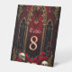 Amor eterno en las sombras de la oscuridad, en estilo gótico. El punto focal es una majestuosa arcada gótica decorada con delicados detalles dorados y brillando sobre un fondo rojo profundo. Las dos elegantes columnas que rodean la arcada le dan un toque sublime al diseño y resaltan el diseño opulento. El corazón colgando suavemente de la arcada dibuja el ojo y está enmarcado por un efecto sanguíneo goteo,