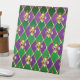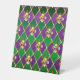 joyas, fondo del Mardi Gras de rhombus violeta y verde, lirios dorados decorados.