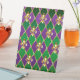 joyas, fondo del Mardi Gras de rhombus violeta y verde, lirios dorados decorados.