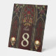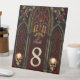 Arco gótico con calaveras. Un gran arco gótico se alza majestuosamente sobre un fondo rojo misterioso y profundo, decorado con detalles ornamentales. Los dos grandes pilares, adornados con delicados tallados, dan a la imagen una elegancia conmovedora. En el centro del arco brilla una impresionante vidriera, cuyo motivo central es una araña, símbolo de paciencia y creatividad. Rodeado por dos cráneos dorados, que recuerdan tanto a la transitoriedad como al amor eterno, el arco cautiva al espectador y promete una celebración llena de misterio y fascinación.