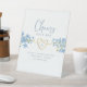 Elegante, moderno, floral y polvoriento boda azul Open Bar símbolo de pedestal con monograma de corazón de cuerda dorada, flores silvestres perwinkle y guión moderno de caligrafía manuscrita. Salud!