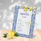 Esta invitación para despedida de soltera presenta un tema azul brillante con cítricos.