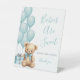 Babies Are Sweet – Please Take A Treat. This cute and charming tabletop sign features an adorable watercolor teddy bear with teal blue balloons, large and off the left side, adding a playful touch. “Babies Are Sweet” appears at the top in large blue script, with “Please Take A Treat” below in matching typography. The design is simple and classic, with gray text in a mix of serif and script fonts. You can customize the background color to fit your theme.