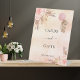 Un fondo de color oro rosa, color rosa oscuro, fino y de aspecto metálico. Decorado con rosa de oro y flores rosadas, rosas, pampas y un chica de oso de peluche sosteniendo un globo rosa. Con el texto: Tarjetas y regalos, Gracias.