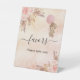 Un fondo de color oro rosa, color rosa oscuro, fino y de aspecto metálico. Decorado con rosa de oro y flores rosadas, rosas, pampas y un chica de oso de peluche sosteniendo un globo rosa. Con el texto: Favors, por favor tómese uno.
