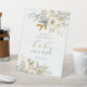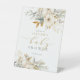 El Signo de bienvenida Neutral Baby In Bloom Baby Shower cuenta con hermosas flores y vegetación florales de marfil, oro y azul, además de caligrafía moderna.