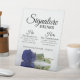 Este letrero de mesa es perfecto para el bar de la recepción de tu boda. Presenta un diseño sencillo y elegante con una foto de un único rosa de color azul marino de tallo largo que refleja una piscina de agua con olas y ondas. El cartel dice: Bebe firma, y hay espacio para su favorito y su favorito.