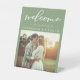 Este sencillo rótulo de bienvenida de boda verde sabio presenta una elegante tipografía blanca para una ceremonia al aire libre en un entorno natural. Guión minimalista sobre la tranquila señalización verde claro para un local rústico afuera de un bosque de árboles.