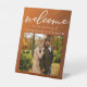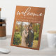 Siga la tendencia otoñal de tonos tierra con nuestro naranja quemado al gradiente marrón caída bodas bienvenido señal de pedestal de bienvenida. Tipografía blanca simple en un poster rústico con la foto de compromiso de su pareja para un aspecto minimalista. Tonos bohemios que recuerdan a la arcilla de terracota resaltan su elegante caligrafía en esta decoración de color de moda y textura desvanecida, con su fotografía romántica.