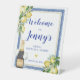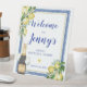 El cartel de bienvenida perfecto para una ducha de novia con tema de limón. Los lémulos enclavados en flores blancas y follaje verde se entrelazan con azulejos azules para crear un marco único.