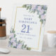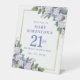 Honre a una mujer especial con este elegante y femenino cartel de bienvenida de la Fiesta de cumpleaños número 21. 21 está escrito en gran texto azul. Sigue la celebración del cumpleaños. El nombre de la persona honrada también está escrito en mayúsculas azules. Los detalles de la celebración de cumpleaños están rodeados de un marco dorado de moda decorado con rosas blancas y flores azules. Los elementos florales están enclavados en hojas verdes profundas.