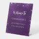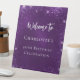 Un cartel de bienvenida para una fiesta de cumpleaños número 40 (o de cualquier edad) glamurosa y femenina. Un fondo violeta profundo decorado con purpurinas falsos, chispas. El color púrpura es desigual. Personalizar y un nombre.