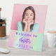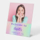 Una señal de bienvenida para un fiesta Sweet 16. Fondo holográfico en color morado, rosa y verde menta. Personalice y agregue su propia foto de alta calidad del chica de cumpleaños. El texto: El nombre en púrpura con una escritura de estilo con letras a mano moderna. Tempates por un nombre.