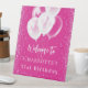 Un cartel de bienvenida para una fiesta de cumpleaños glamurosa y femenina de 21 años (o de cualquier edad). Un fondo rosa de moda con elegantes chispas falsas y globos blancos. Personalice y agregue un nombre y una edad de 21 años. Letras blancas.