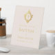 Un letrero de bienvenida para el bautizo de una niña en rosa y dorado.