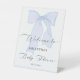 Bienvenido a este Baby Shower Bow Blue Welcome Sign! Con un hermoso arco ilustrado, suaves tonos azul pastel y una tipografía elegante, este letrero marca el tono perfecto para una celebración sofisticada y memorable. Personalízalo con el nombre de la futura madre y los detalles del evento para un toque único.
