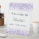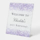 Un cartel para una fiesta de cumpleaños glamurosa y femenina del 21 (o de cualquier edad). Un elegante fondo blanco, decorado con purpurinas falsos de color violeta y lavanda, chispas. Personaliza y agrega una fecha, nombre y edad 21.