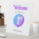 Sencillo y divertido cartel de bienvenida de primer cumpleaños morado con un ilustracion de un globo azul sobre un fondo acuarela. Perfecto para añadir a su tabla de refrescos. Ilustrado y diseñado por Patricia Álvarez.