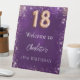 Un cartel de bienvenida para una fiesta de cumpleaños glamurosa y femenina. Un fondo violeta profundo decorado con purpurinas falsos, chispas. El color púrpura es desigual. Personalizar y un nombre.