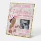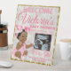 Hermosa niña africana sentada con un enterizo rosado gruñón y un gran arco rosa para la cabeza, sosteniendo una hebra rosa de perlas sobre un fondo floral de clavel blanco Purpurina de oro. ¡Añade tu propia foto al marco rosado! Personalizar el texto como desee. Perfecto para Baby Shower o fiesta de cumpleaños. ©2023 Señales de Miss Fiesta Sassy