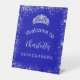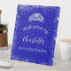 Una pensión de bienvenida para una fiesta de cumpleaños 15, de chicas y glamurosas de Quinceañera. Un fondo azul real con elegante polvo de plata falsa y una tiara, corona. Personalice y agregue un nombre y una edad. Letras blancas. El nombre está escrito con una escritura de estilo con letras a mano moderna.