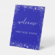Una señal de bienvenida para un fiesta. Un fondo azul real. Decorado con un falso purpurina de plata. Personaliza y agrega tu nombre. Texto blanco.