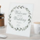 Una minimalista corona de olivo pintada con acuarelas, que da la bienvenida a los huéspedes, con sus nombres y fecha numérica de boda en el interior.
