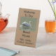 Añade una bienvenida especial a tu casa de playa con este cartel que incluye una foto de un pelícano. Este hermoso pájaro grande está flotando en el agua y relajándose. Un mensaje de bienvenida, así como un fácil acceso a su código wifi y número de contacto de emergencia, se pueden configurar en cualquier lugar de su hogar. El fondo marrón y todo el texto se pueden personalizar fácilmente. Foto original - C. McGouldrick