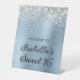Crea tu propia fiesta de cumpleaños número 16, señal de bienvenida para tu amigo. Cambie el color del tipo de letra blanco a blanco o azul oscuro si lo desea. El fondo cuenta con un purpurina de plata brillante con un Relieve metalizado digital de imitación azul polvoriento pálido, todo el brillo, el purpurina y el brillo se crean con elementos digitales que se imprimen como una foto.